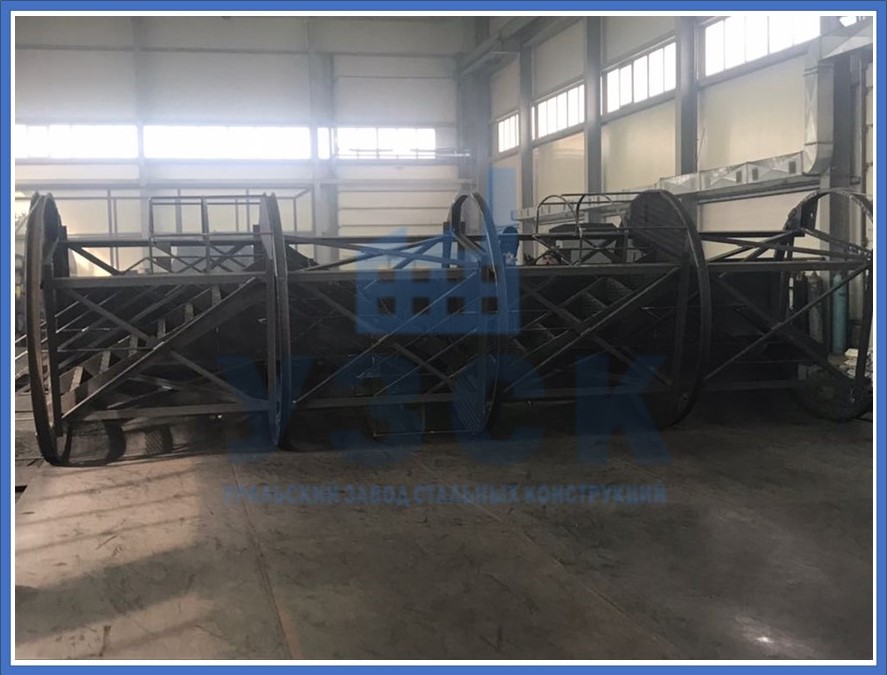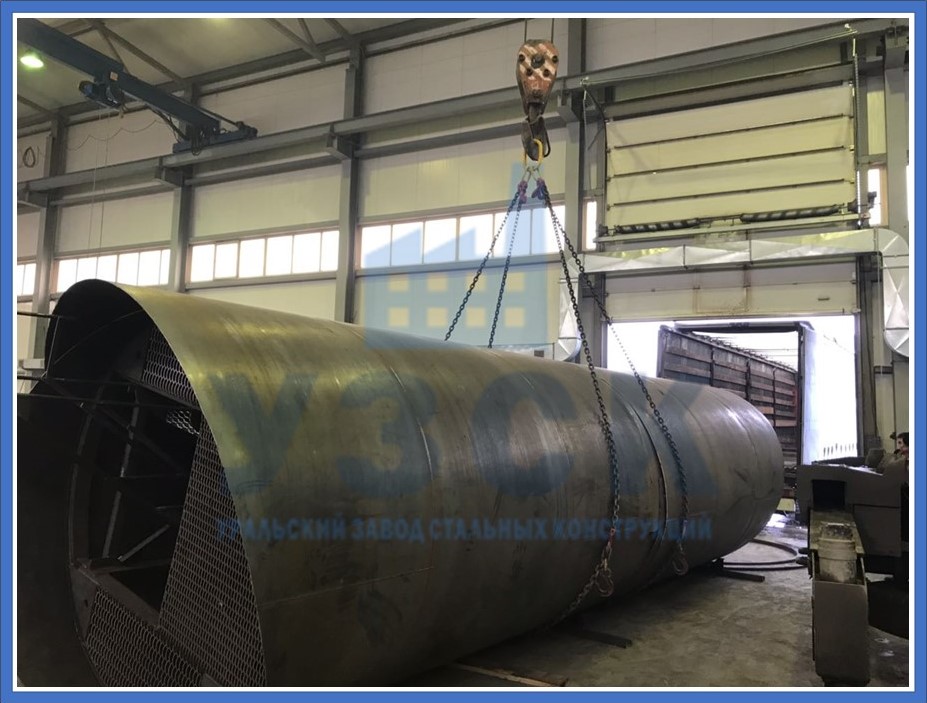 На заводе готовятся листы стали с максимальным размером 2 500х10 000 мм. Их завальцовывают на нужный радиус, чистят срезы и упаковывают. Также готовят сборные детали днища. Стыковка всех элементов ведется на площадке, методом сварки. Рабочий чертеж указывает последовательность соединения промаркированных заготовок. Швы подвергаются неразрушающему контролю.